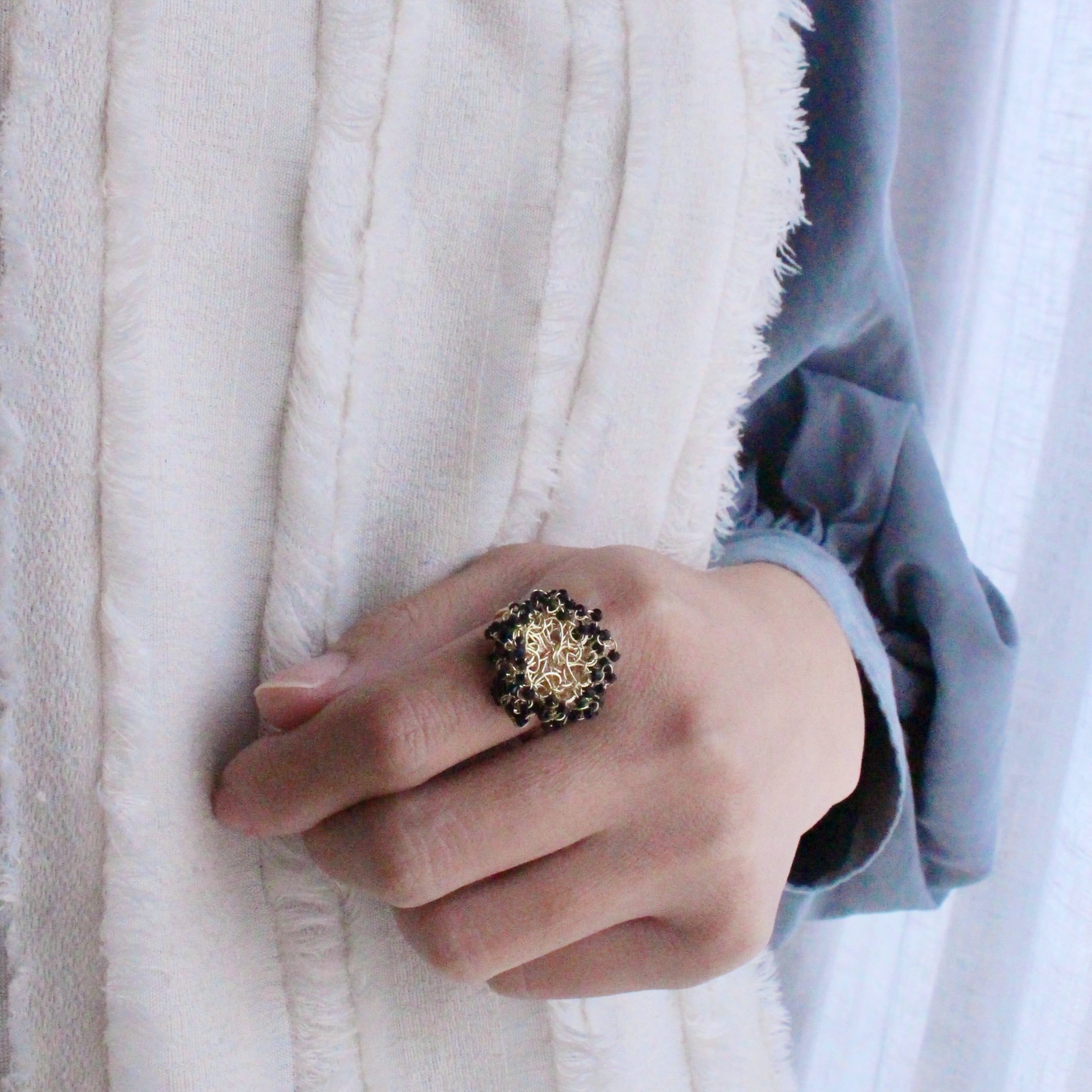 ビーズを丁寧に編み込んだ mini rosetta ring。